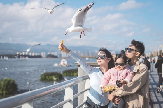 11月10日,游客在云南省昆明市海埂大坝投喂红嘴鸥。