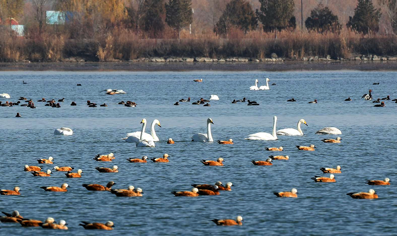11月12日,大天鹅等鸟类在张掖黑河湿地国家级自然保护区高台段一处湖泊休憩觅食。入冬以来,大批候鸟陆续飞抵位于甘肃省张掖市的张掖黑河湿地国家级自然保护区高台段休憩觅食。作为全球9条候鸟迁徙通道之一的中亚通道的重要中转站,每年约有18万至25万只水禽在张掖黑河湿地国家级自然保护区集结、停歇。 新华社记者张智敏摄