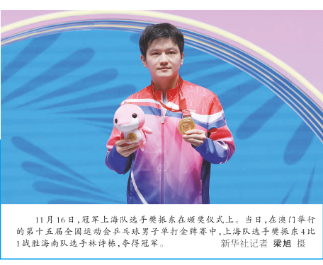 新华社澳门电(记者 郭雨祺岳冉冉)11月16日,第十五届全运会乒乓球项目男子单打决赛在澳门举行,上海队樊振东4:1战胜海南队林诗栋,成功卫冕男单冠军,同时收获了自己第六枚全运会金牌。
