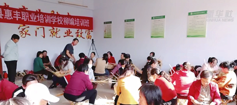 在山西朔州右玉县惠丰职业培训学校的柳条编织课堂上,女学员们在技能老师的培训指导下,将一根根柳条编织成美观实用的手工艺品。