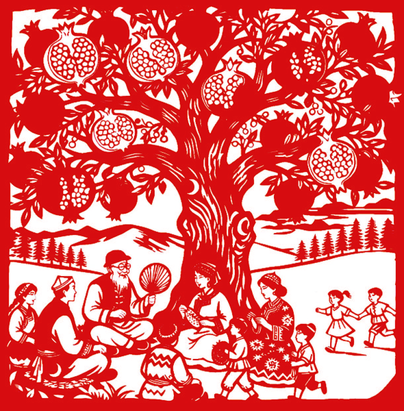 作品最具视觉冲击力的是硕果累累的石榴树,其枝头既有象征团圆的闭合果实,更有绽开笑口、紧密饱满的籽粒,其巧妙地将“多籽多福”的传统吉祥寓意升华为民族团结的深刻隐喻。树下,身着各民族服饰的人们自然围坐,老者摇扇闲谈,眉眼间尽是温和笑意;孩童们追逐嬉戏,共同构成一个充满烟火气息的“共话家常”场景。这一设计将深刻的主题融入可亲可感的日常生活,共同构成了各民族交往、交流、交融,亲密无间的和谐画面。