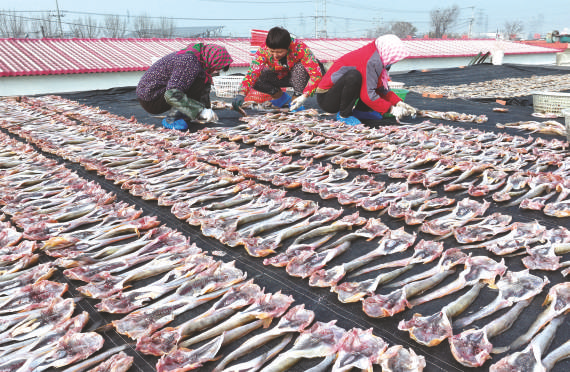 初冬时节,河北省唐山市丰南区黑沿子镇的渔民利用晴好天气,将捕捞的鱼虾等海产品进行加工、晾晒,供应市场。