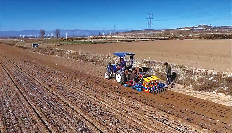 除了良种、良法、良田的共同赋能,还离不开良机的帮助,也就是铺设黑色全生物降解渗水地膜的机器。山阴县使用的机器一机多能,机器先把土壤整形成床,之后铺膜打孔穴播,最后镇压,可以一次性完成土壤的整形覆膜、镇压、播种、铺设滴灌带。这个机器是当地地形条件,经过几年的探索和试验得出来的结果。除了种小麦,根据不同作物的特点调整播种量后,还可以种植一科的燕麦、谷子。