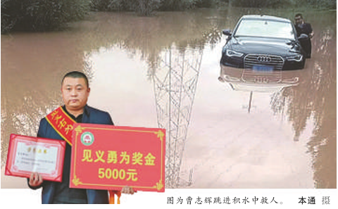 刚结束井下工作的曹志辉正好途经此地。当看到车内有人挥手求救时,立刻跳进深水,靠近车辆,俯身探入车窗,艰难地将被困的陈某转移到安全地带。