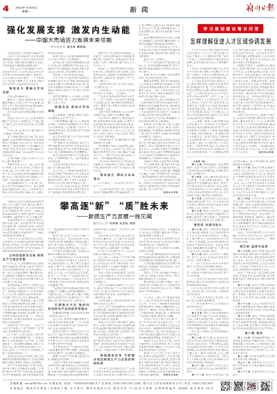 展望“十五五”,在以习近平同志为核心的党中央坚强领导下,以科技创新为引领、以实体经济为根基,坚持全面推进传统产业转型升级、积极发展新兴产业、超前布局未来产业并举,加快建设现代化产业体系,新质生产力必将加速成长,持续塑造中国经济高质量发展的新动能与新优势。 新华社北京电