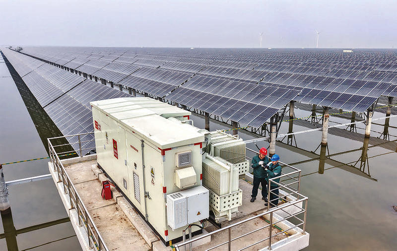 近年来,河北省沧州市依托沿海滩涂、水产品养殖场、盐场等资源,有序发展“渔光互补”光伏发电、风力发电等新能源项目,助力经济绿色低碳发展。据国网沧州供电公司介绍,目前该市风电、光伏发电等清洁能源装机容量达到1010.7万千瓦,占统调总装机容量的62.14%。 新华社记者 杨世尧 摄