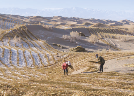 一场冬雪过后,在甘肃省酒泉市阿克塞哈萨克族自治县的库姆塔格沙漠边缘,施工人员忙着铺设沙障,有序推进甘肃省酒泉市祁连山北麓阿克塞片区水源涵养与生态保护修复项目。该项目总规模22.2万亩,包括工程固沙、封滩(沙)育林、人工造灌木林等防沙治沙项目。