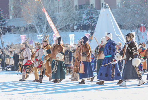 12月21日,第二十一届内蒙古自治区冰雪那达慕在呼伦贝尔市海拉尔区伊敏河文化休闲长廊拉开帷幕,吸引众多中外游客和市民前来参加。图为开幕式上的民俗表演。