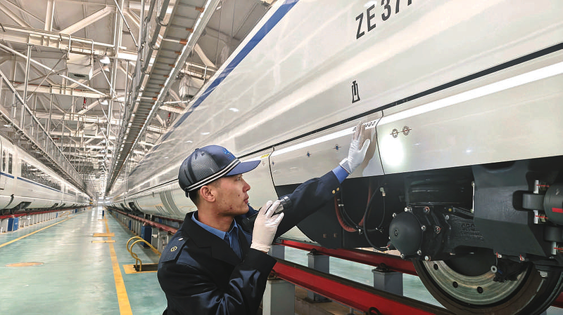 12月21日,中国铁路兰州局集团有限公司兰州车辆段银川动车运用所的工作人员对列车进行检修。他们用专业的坚守,护航每一趟列车的冬日征程,守护万千旅客的平安归途。新华社记者 邢广利 摄