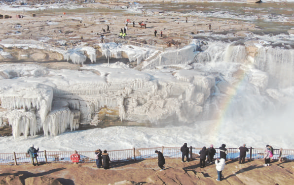 1月6日,游客在山西吉县黄河壶口瀑布景区欣赏“冰瀑玉壶”和彩虹景观(无人机照片)。受持续降温天气影响,位于山西吉县和陕西宜川县交界的黄河壶口瀑布形成“冰瀑玉壶”壮美景观,层层叠叠的冰瀑与瀑布上空的彩虹相映成趣,美不胜收。