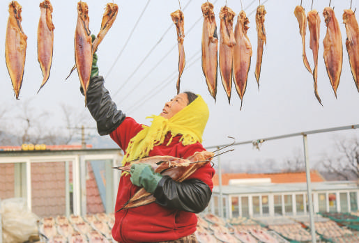 1月6日,山东省青岛市即墨区鳌山卫街道渔民在晾晒鱼干。春节临近,山东省青岛市即墨区沿海一带的渔民趁着晴好天气,将捕获的海鱼经过切割、腌制、晾晒等工序加工成鱼干,供应年货市场。