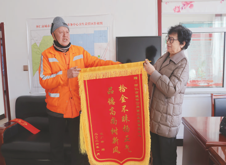 本报讯 近日,怀仁市城市公用事业发展事务中心迎来一位特殊的访客——市民汪阿姨,她手持一面锦旗,专程向环卫二队环卫工人张钰表达由衷谢意。这温情一幕的背后,是一段拾金不昧的暖心故事。