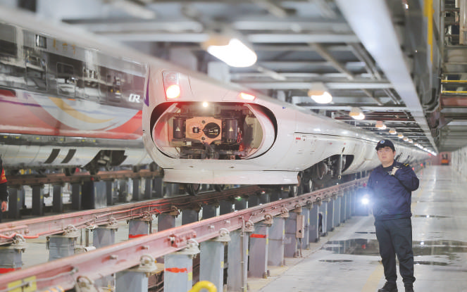 图为在天津动车运用所检修库内,李奇伟进行列车重联作业。深夜的天津动车运用所检修库内,灯火通明,数列动车组整齐停靠在检修线上,等待“体检”。为确保春运列车安全准时出库,一级检修丁组工长李奇伟带领40余名同事彻夜奋战——从23时到次日8时,他们需完成28组动车的检修任务,工作量比平日增加了约20%。从车顶受电弓、空调罩板到车下裙板、转向架……每一处部件都需细致检查。 新华社记者 李然 摄