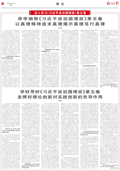 习近平总书记指出:“推进马克思主义中国化时代化是一个追求真理、揭示真理、笃行真理的过程。”《习近平谈治国理政》第五卷收入习近平总书记在2022年5月27日至2024年12月20日期间的重要著作,共有报告、讲话、谈话、演讲、致辞、文章、指示等91篇,是当代中国共产党人追求真理、揭示真理、笃行真理所取得的重大理论成果,是习近平新时代中国特色社会主义思想最新成果的系统反映,是学习领会习近平新时代中国特色社会主义思想的权威文献。全党要深入学习这部重要文献,在学思用贯通、知信行统一中感悟真理力量、汲取智慧营养、激发奋斗精神,着力让“思想的闪电”射中当代中国这样一片生机勃勃的沃土,把党的创新理论转化为坚定理想、锤炼党性和指导实践、推动工作的强大力量。