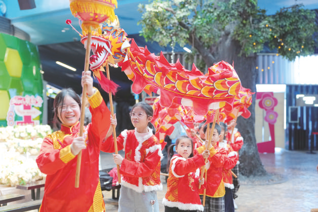 小朋友在杭州青少年活动中心参加舞龙表演。