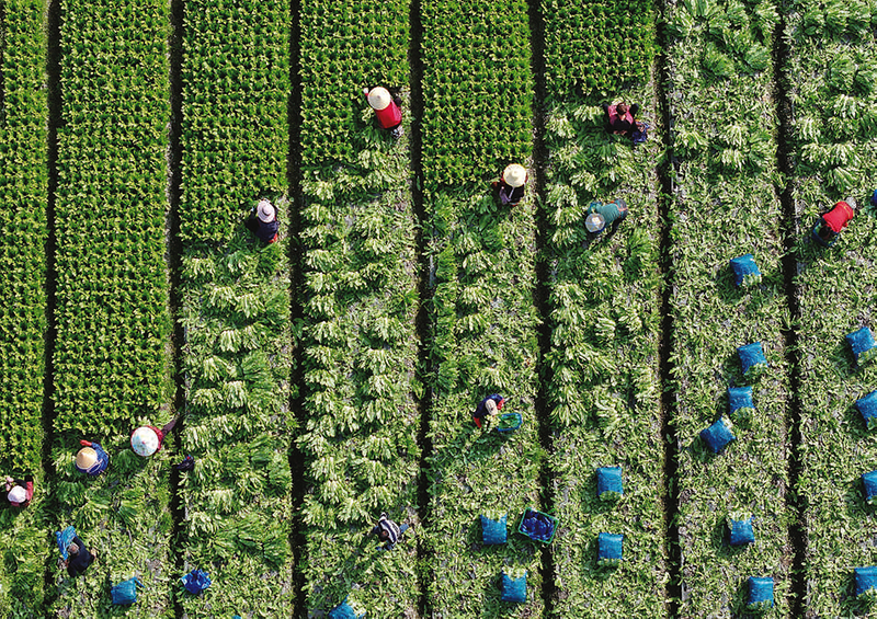 2月24日,农民在四川成都市彭州市九尺镇玉源社区的田地里采收油麦菜(无人机照片)。时下,大江南北农事渐忙。各地农民抢抓农时、备耕备种、采收管护,田间地头一派忙碌景象。 新华社发 罗国杨 摄