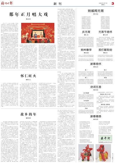 挑水累且危险,但每年除夕我最是不愿却不得不干的是另外三件事:一是贴对联。我家有三间上房,一间库房,一排兔窝鸡窝,见门见窗的地方都要贴满对联——梁上要贴“抬头见喜”,门口要贴“出入平安”,兔窝鸡窝要贴“六畜兴旺”,炭堆要贴“炭积如山”……加上姥爷家的,大大小小二、三十副五、六十张对联。前一年贴的时候只怕它经受不住365天的风霜雨雪,密密麻麻严严实实地涂满浆糊,新年要把旧的对联和背后的浆糊清理得干干净净,煞费气力。新桃总是怕不牢,旧符却又难去,一年又一年,周而复始。