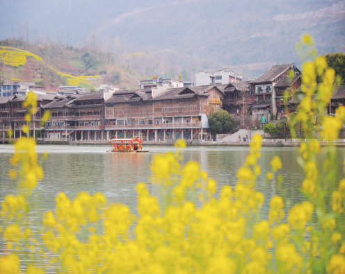 3月6日,游客在重庆市黔江区濯水古镇乘坐电动竹筏游览阿蓬江。