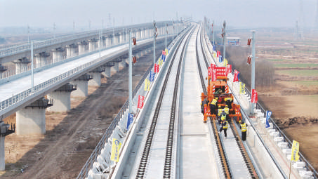 在济(南)滨(州)高铁山东滨州站,中铁四局的工作人员在进行铺轨作业。