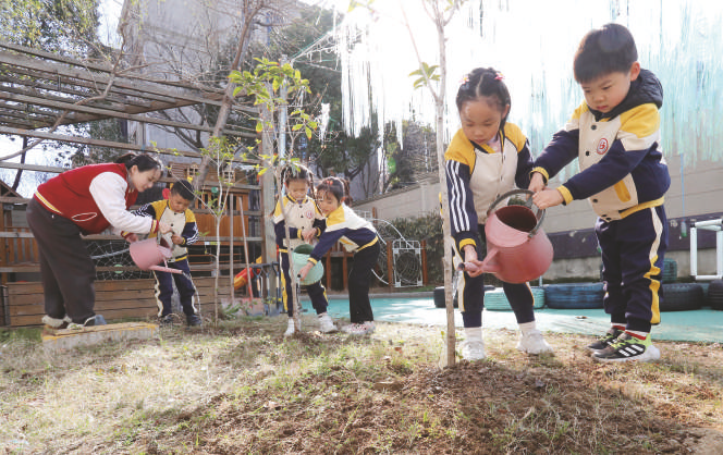 3月10日,在江苏苏州高新区实验幼儿园,孩子们和老师一起给刚栽种的树苗浇水。植树节前夕,人们在春光中参加植树活动,为大自然增添新绿。 新华社发 杭兴微 摄