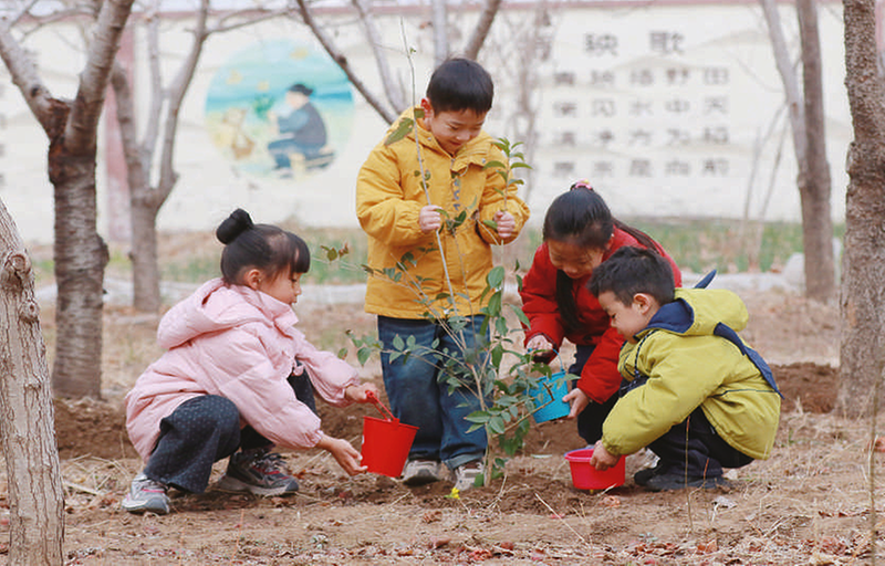 3月 12日,山东省高密市金苹果幼儿园的小朋友在栽种树苗。