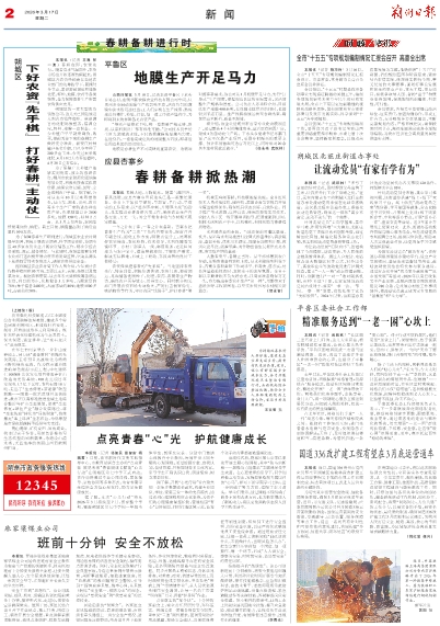 人勤春来早,备耕正当时。从干部部署到农户行动,从物资储备到农机上阵,从水利检修到科技下乡,杏寨乡春耕备耕工作动手早、节奏快、落点实,处处洋溢着抢抓农时、真抓实干的浓厚氛围。全乡干群以辛勤耕耘不负大好春光,以周密准备确保万无一失,奋力跑出春季农业生产“第一棒”,用勤劳双手描绘沃野丰收新画卷,以坚实步伐书写乡村振兴新篇章。 (贺永智)