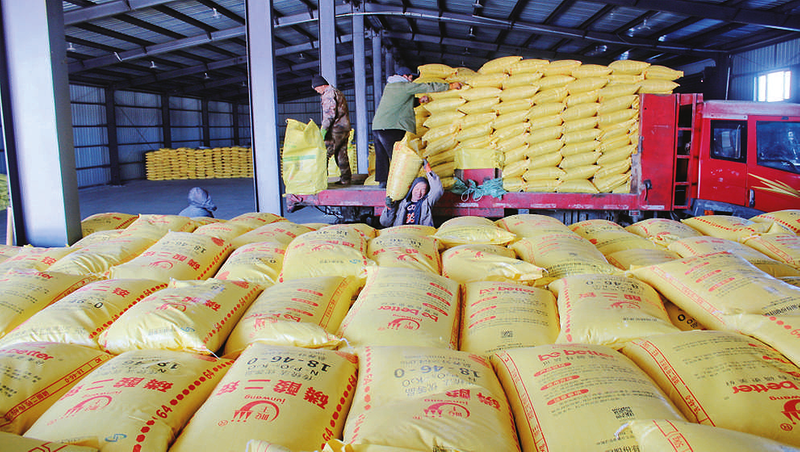 3月16日,在北大荒集团黑龙江格球山农场有限公司农业科技服务中心,工作人员在搬运配方肥料。