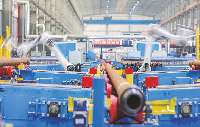 3月17日,在中海油服钻井事业部钻具检维修自动化车间,机械臂对钻杆进行保养。天津市滨海新区的中海油田服务股份有限公司钻井事业部钻具检维修自动化车间2024年9月正式开工建设,2025年9月底实现全线投产运营。投产以来,累计检维修钻具数量超6万根。通过集成先进的自动化控制系统、在线检测技术与物联网数据平台,该自动化车间实现了从钻具清洗、检测、修理到喷涂标识的全流程自动化作业,为海上油气高效勘探开发提供有力支撑。 新华社发 杜鹏辉 摄