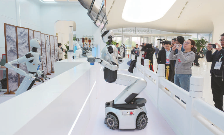 在中关村国际创新中心,嘉宾在参观机器人餐吧。3月25日,2026中关村论坛年会在北京开幕。本届论坛年会主题为“科技创新与产业创新深度融合”,设置论坛会议、成果发布、技术交易、前沿大赛、配套活动五大板块,共百余场活动。