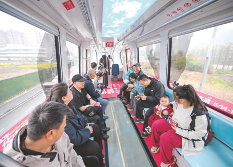 游客乘坐空轨列车游览。近日,湖北发布中国光谷科技旅游线路,推出超级工厂线、人工智能线和低空文旅线三大主题科技旅游线路。这些线路将科创与文旅观光融合,方便游客近距离体验。