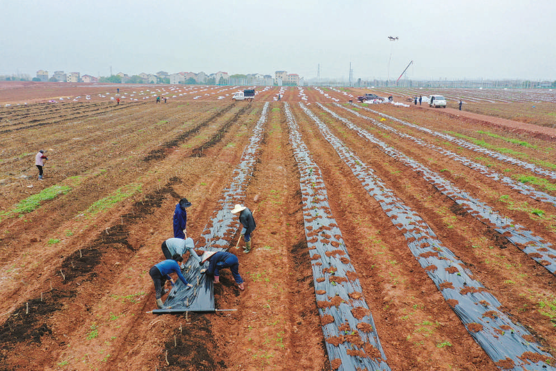 3月27日,浙江省金华市金东区东孝街道农民在田间覆盖地膜。随着气温回暖,各地农民抢抓农时,在希望的田野上勾勒生机勃勃的春耕画卷。 新华社发 时宽兵 摄