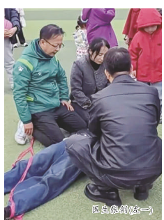 本报讯 3月29日傍晚,朔城区民福西街体育广场上演了一场惊心动魄的生命救援——一名30多岁的女性带孩子跳绳时,突发心脏骤停后仰倒地、失去意识。危急时刻,正在操场锻炼身体的朔城区人民医院骨科医生张剑听到人群中的急促呼救,第一时间冲上前,进行专业的施救。